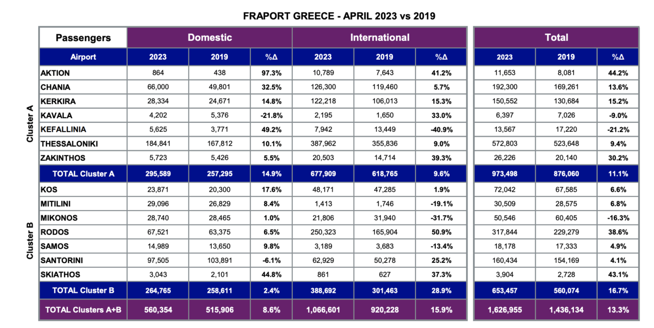 Ειδικότερα, μόνο για τον μήνα Απρίλιο, που σηματοδοτεί και την εκκίνηση του θερινού προγράμματος για κάποιες από τις αεροπορικές, η αύξηση της επιβατικής κίνησης στα 14 περιφερειακά αεροδρόμια (Ακτιο, Χανιά, Κέρκυρα, Καβάλα, Κεφαλλονιά, Θεσσαλονίκη, Ζάκυνθος, Κως, Μυτιλήνη, Μύκονος, Ρόδος, Σάμος, Σαντορίνη, Σκιάθος) ήταν στο +13,3%, φθάνοντας συνολικά τα 1,63 εκατομμύρια επιβάτες έναντι των 1,44 εκατ. επιβατών του Απριλίου του 2019.